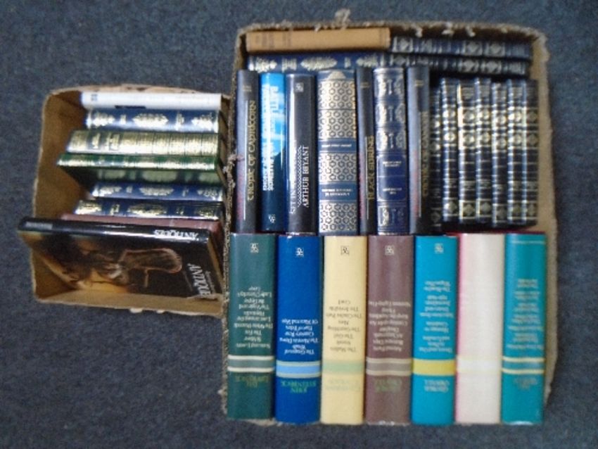 Two boxes containing hardback volumes including the works of H. G. Wells, George Orwell, Catherine Cookson, Peebles, William Shakespeare etc.