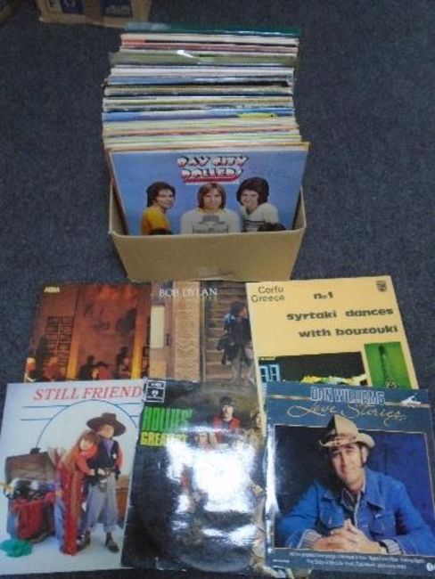 A box containing vinyl records including Elvis, world music, easy listening etc.