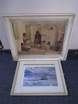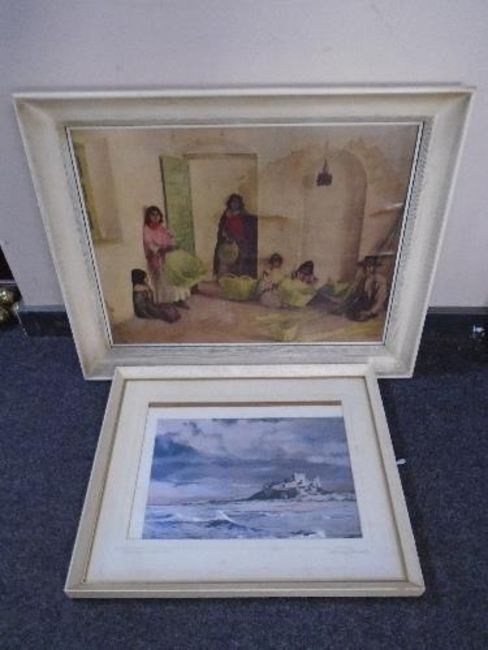A Ronald Moore signed print - Bamburgh castle, together with a further 20th century print - The basket makers of Saville
