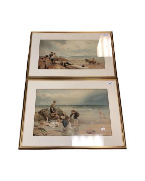 After Myles Birket Foster : Children Gathered Around a Rock Pool at the Sea's Edge, chromolithograph, with the artist's printed monogram, 29 cm x 45 cm, together with another chromolithograph (smaller) after the same artist depicting a similar subject, both parts framed. (2)