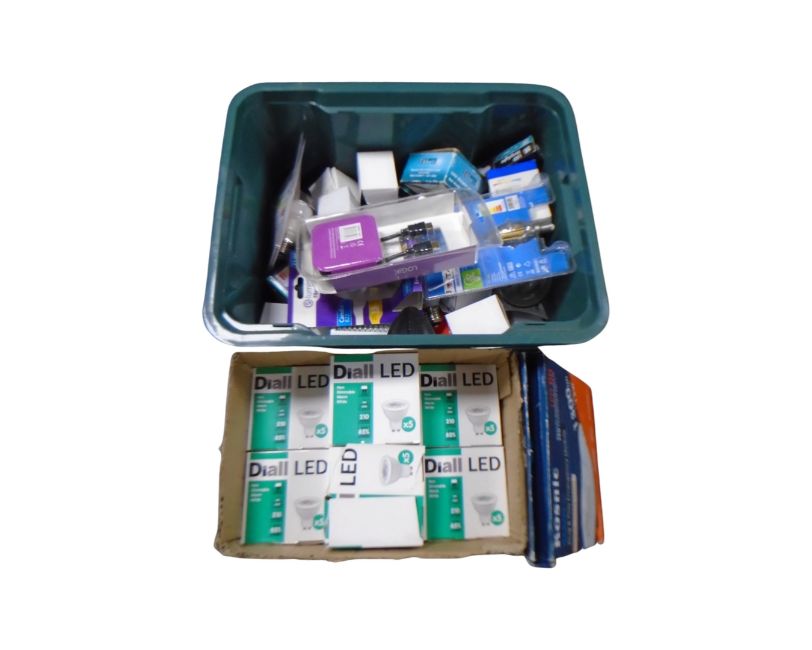 Two boxes of LED bulbs, energy bulbs, HDMI cable etc