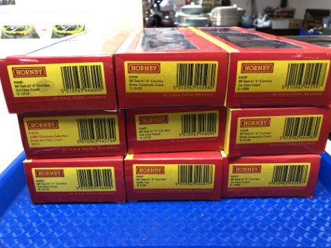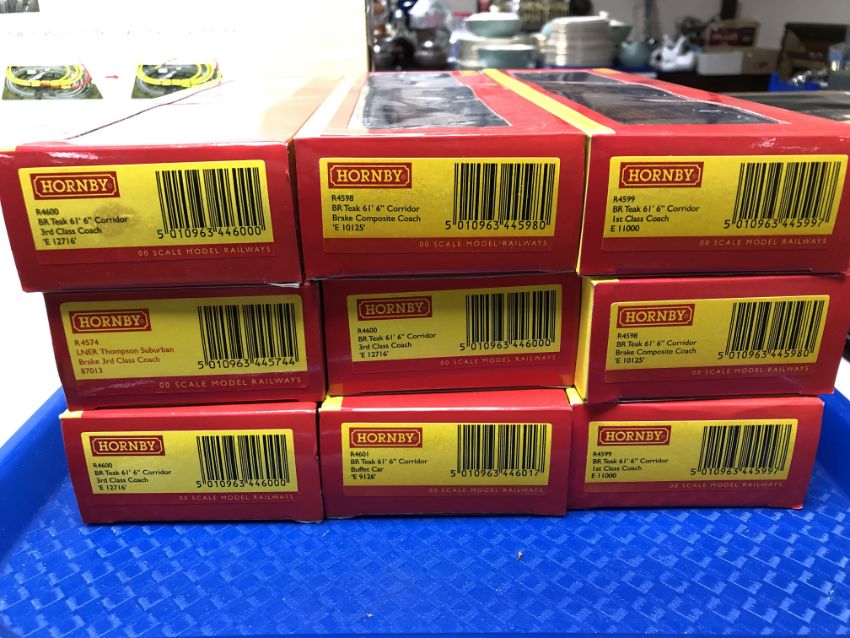 Eight Hornby BR teak 3rd class coaches together with an LNER Thompson suburban brake 3rd class coach, OO gauge. (9, boxed)