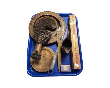 A tray containing wooden tourist pieces, silver plated meat skewer, a Big Ben Cogétama cigar in box.