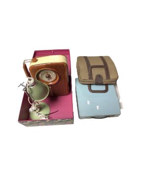Two boxes of vintage typewriters, artist case, Bush radio, angle lamp etc