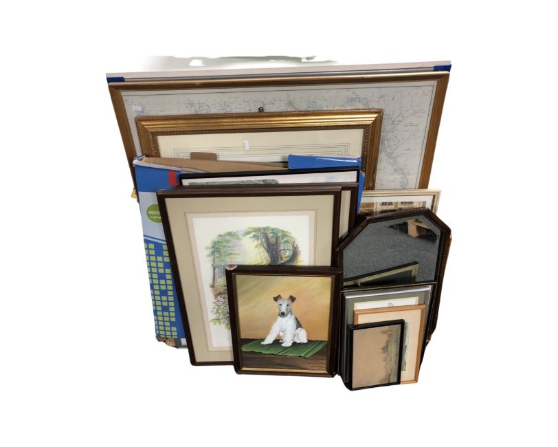 A large quantity of assorted pictures to include framed map, signed and limited edition print of Durham Cathedral, painted mirror etc
