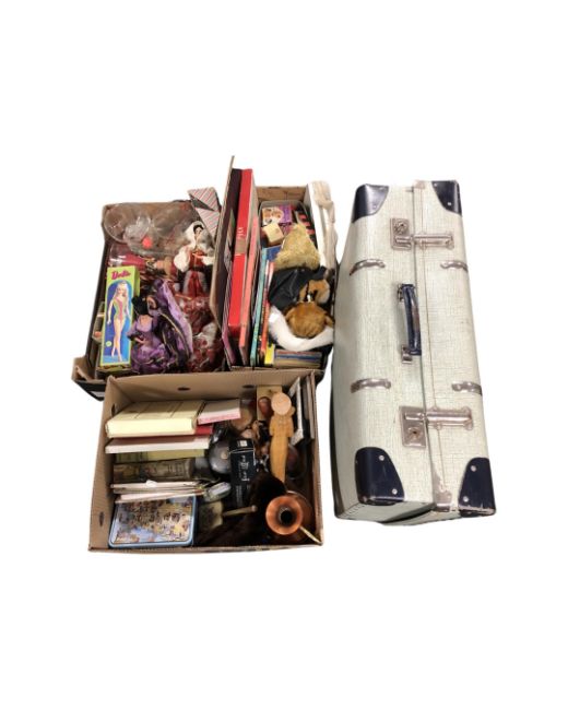 A vintage luggage case together with three boxes containing world dolls, boxed Barbie doll, children's books, soft toys, playing cards, knitting patterns etc.