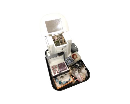 A tray containing contemporary tabletop jewellery chest together with a quantity of assorted costume jewellery, lady's wristwatch set.