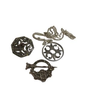 A Scottish silver scarf brooch, together with a silver pendant on chain and a further silver marcasite brooch. (3)
