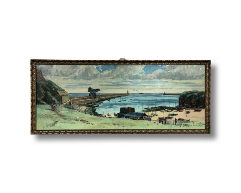 Alan Reid Cook RSMA (1920 - 1974) : A View of Tynemouth and South Shields Lighthouse across the mouth of the Tyne, oil on board, 100cm by 38cm, Terrence McArdle Gallery label verso. CONDITION REPORT: Marine and landscape painter in oil, pastel and watercolour.Born at Gateshead. After WW2 he decided to become an art teacher and trained at Canterbury Art School. On completing his studies he taught art at Ralph Gardiner School and North Tyneside College.Exhibited at the Royal Society of Marine Artists and the Artists of the Northern Counties exhibitions at the Laing Art Gallery.In 1973 he was elected as a member of the Royal Society of Marine Artists (the only artist in that year elected as a member). In the same year he was elected a member of the Pastel Society.His work is represented in the National Maritime Museum, Shipley Art Gallery and in other public and private collections.