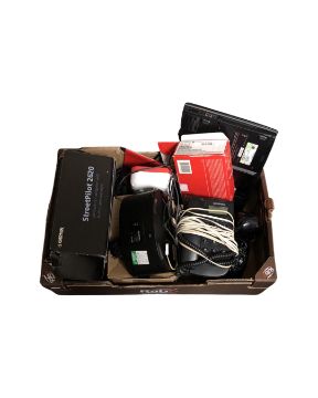 A box of assorted electricals, DAB radios, Advent laptop, home phones etc