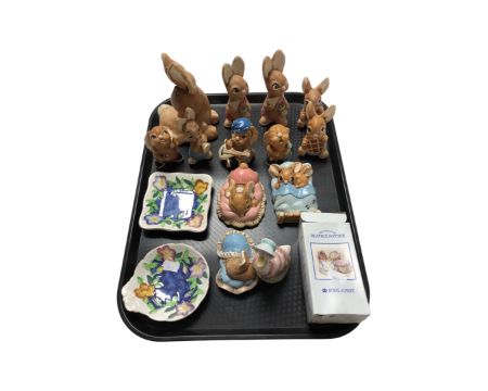 A tray containing two Maling dishes, a Royal Albert Beatrix Potter figure, Jemima Puddle-Duck (boxed), together with further Pendelfin figures.