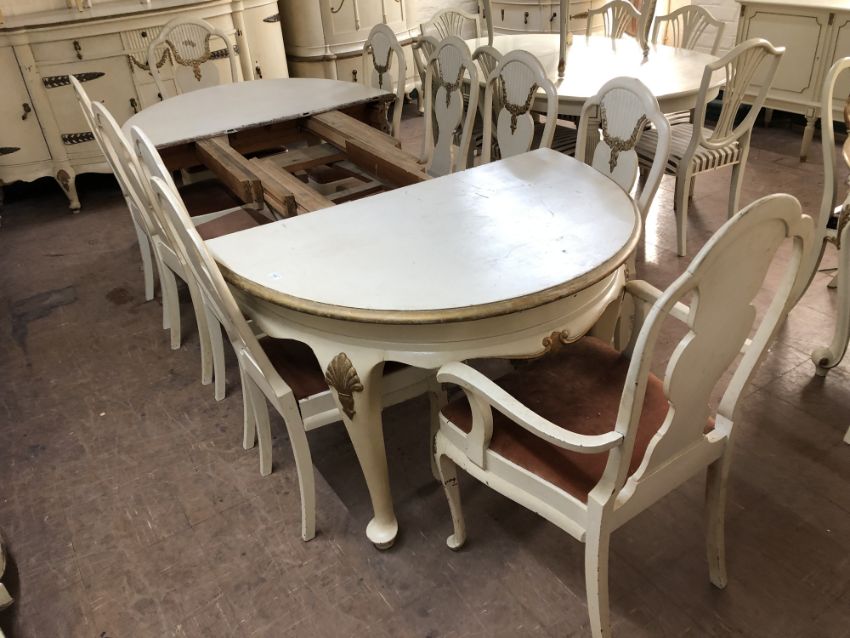 A continental white and gilt oval dining table length 158 cm (no leaves) together with a set of ten matching chairs
