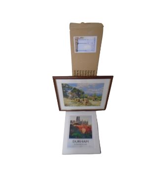 An LNER Durham print, together with a framed tapestry and boxed clothes rail