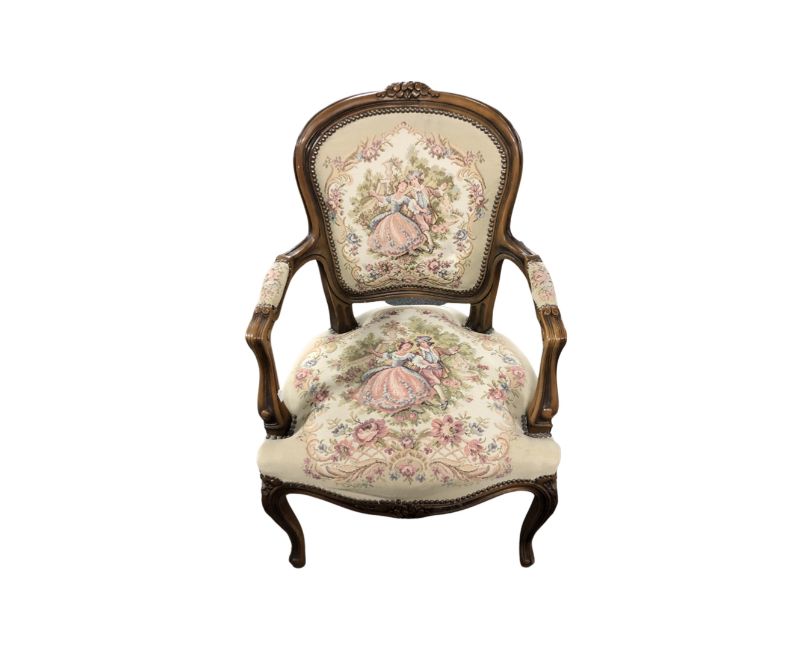 A beech framed French salon armchair in tapestry fabric