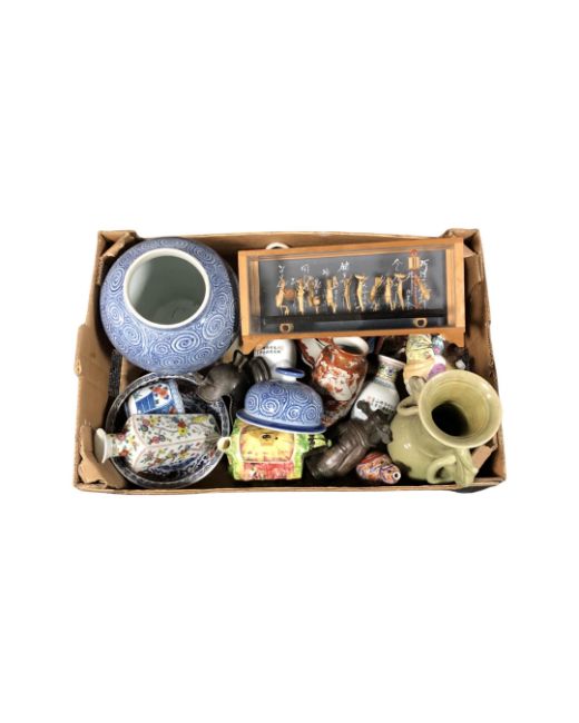 A box containing Chinese and English ceramics, vases, figurines, teapots, bamboo band montage in display case
