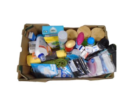 A box of cleaning products, bin bags, face masks, tissues, kitchen storage jars etc