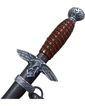 A German Third Reich 2nd Pattern Luftwaffe Officer's Dagger by Alcoso, Solingen, 25cm blade with etched maker's mark, brown plastic grip wire-bound, swastika pommel, pebbled steel scabbard with oak leaf motifs, with velvet and silver thread suspension strap.