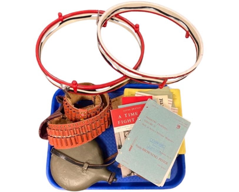 A collection of infantry training manuals and other military related books, a leather ammunition belt, a flask, two drum rims.