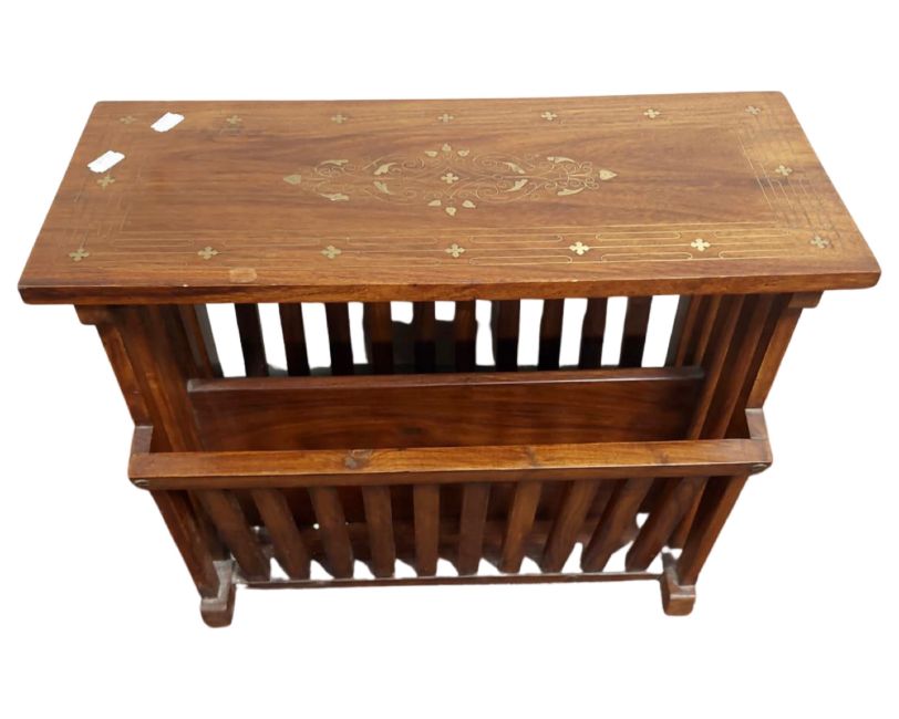 A brass inlaid hardwood magazine rack. (width 52cm)