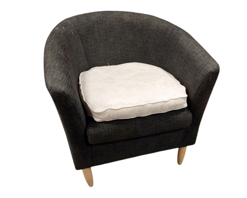 A tub chair in grey upholstery. (width 76cm)