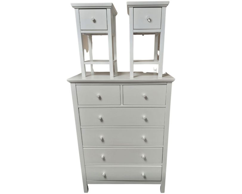 A contemporary white six drawer chest together with a pair of matching bedside tables