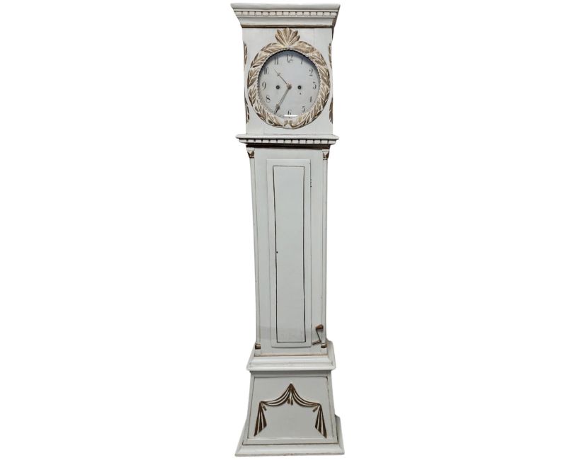 A 19th century Continental cream and gilt long cased clock, with weights.