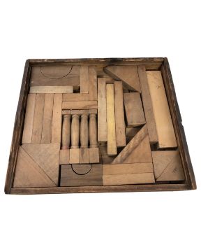 A vintage wooden construction set in tray