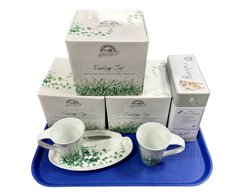 A tray of boxed Ringtons Trailing Ivy porcelain together with a tin of Wrendale designs recipe cards.
