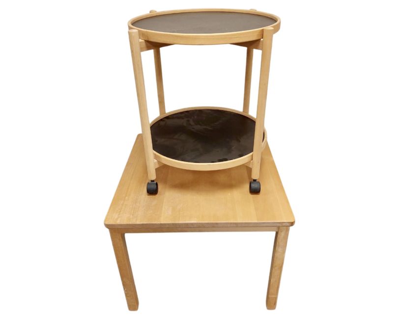 A late 20th century Scandinavian two tier serving trolley together with a square coffee table.