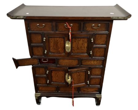 A Chinese elm altar cabinet fitted with drawers. (width 79cm)