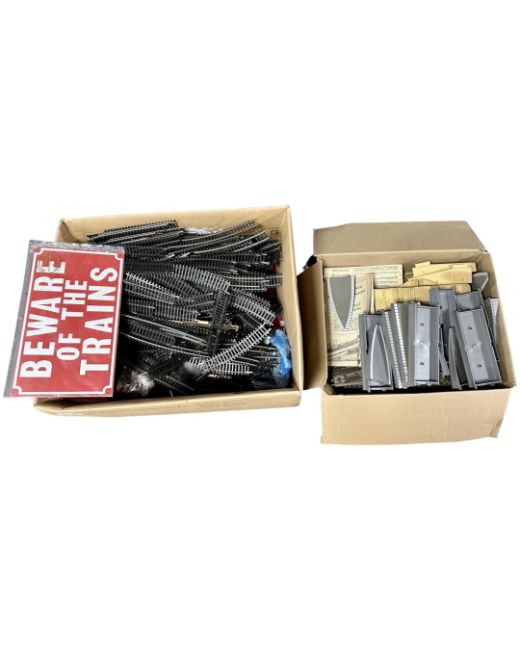 Two boxes containing model railway track and further modelling materials.