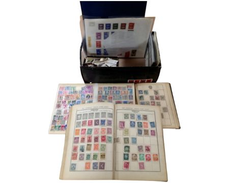 A box containing stamp albums, antique and later stamps of the world, First Day covers, tea cards etc