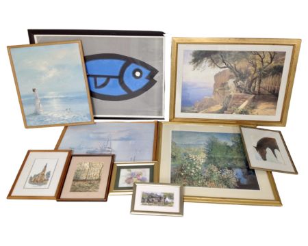 A collection of assorted pictures and prints including an oil on board, Lady in Victorian Dress, a D. H. Cole watercolour of a horse etc.