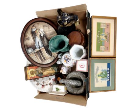 A box containing a marble pestle and mortar, Hornsea storage jar, Royal Doulton figure, chalk fireside Alsatian dog, wall plaque etc.