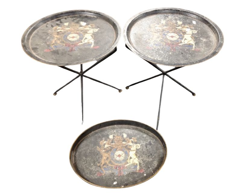 A pair of metal folding occasional tables bearing coat of arms together with matching serving tray