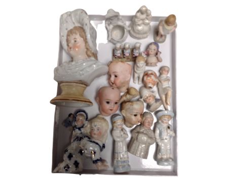 A tray containing a collection of antique china doll's heads and figurines.