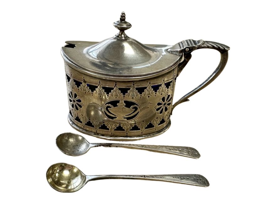 A silver mustard pot, Harrison Brothers and Howson, Sheffield 1903, together with two silver salt spoons.