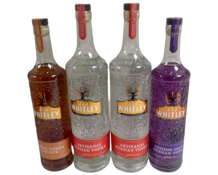 Four bottles of J J Whitley to include Artisanal Russian Vodka (X2) 1l, Toffee Vodka Liqueur 70cl and Passion Fruit Russian Vodka 70cl.