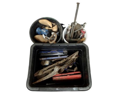 Two buckets and plastic tub containing hand tools, cased socket set etc