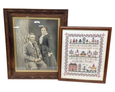 An Edwardian photograph of a lady and a gentleman, in carved oak frame, together with a contemporary sampler.