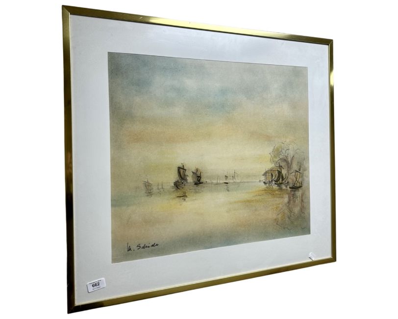A Continental colour print depicting boats at sunset, 57cm by 49cm.