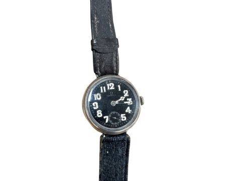 An early 20th century Omega trench wristwatch, black dial with luminous Arabic numerals and subsidiary seconds, later crown, case 34mm.
