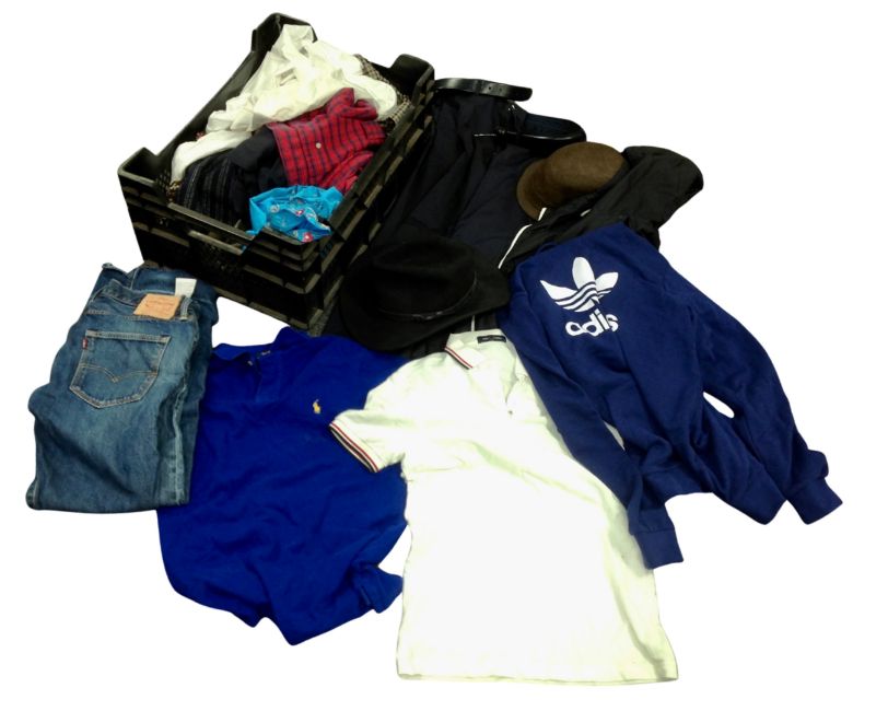 Two boxes containing assorted clothing including Hugo Boss, Ralph Lauren, Nike, Adidas, Ben Sherman etc together with assorted hats, a vintage luggage case and a holdall.