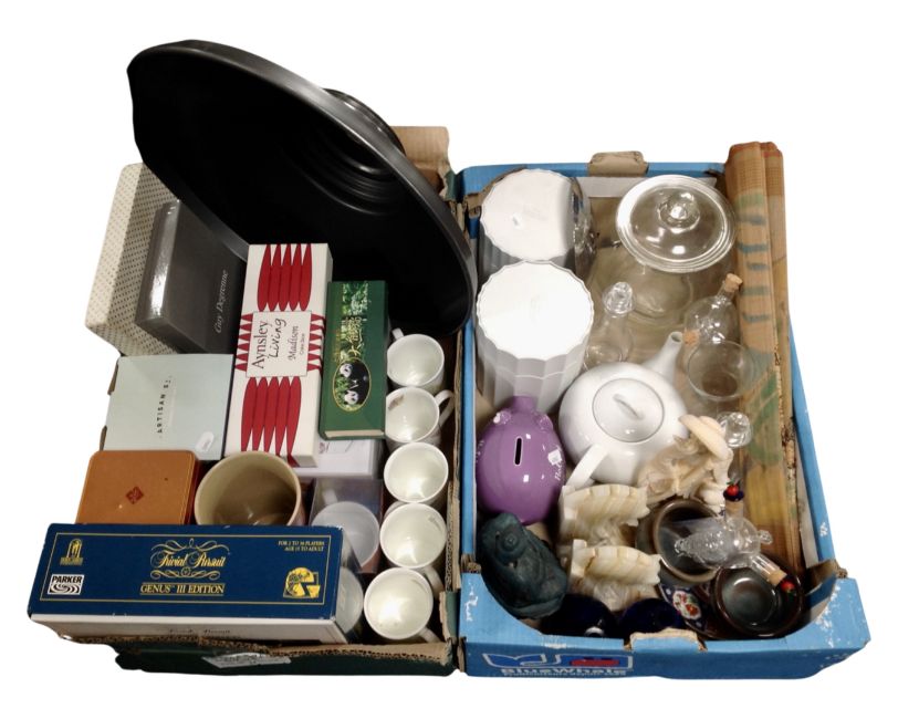 Two boxes containing storage jars, glassware, figurines, marble book ends, metal lightshade, mugs, board game etc.