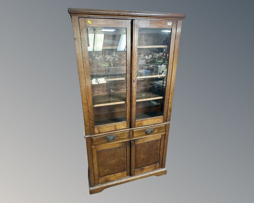 An Edwardian oak glazed double door bookcase fitted with cupboards and drawers beneath.