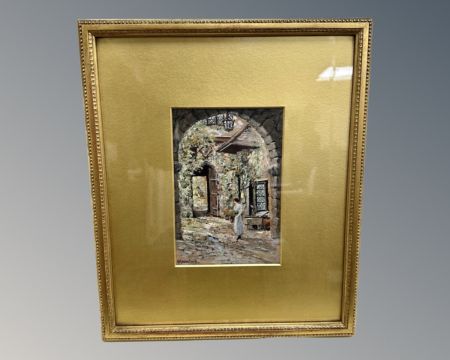 Herbert Moxon Cook (British, 1844-1928) : Lady standing beneath an archway, watercolour, framed, 13cm by 19.5cm.