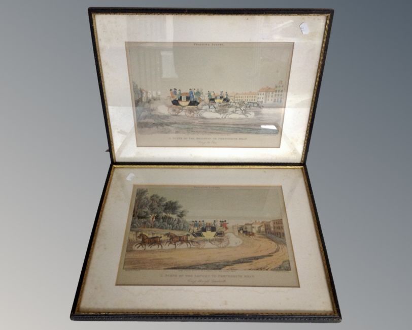 Two antiquarian colour etchings depicting coaching scenes, in Hogarth frames.