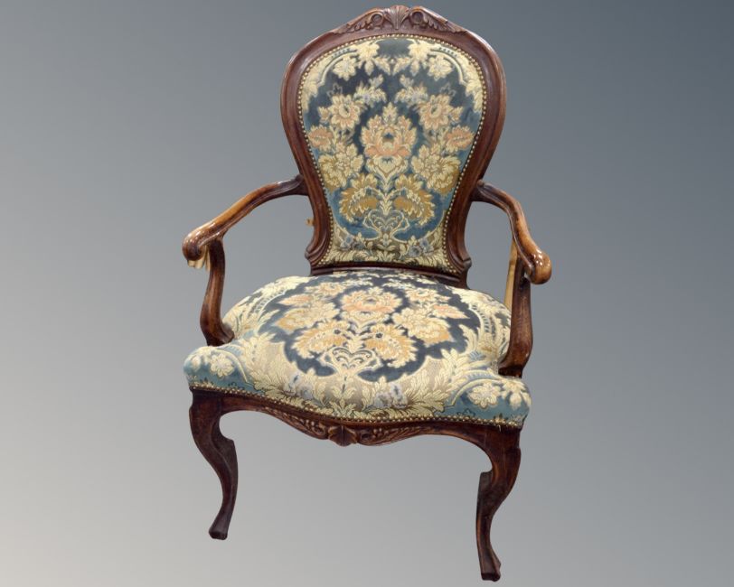 A French beech framed salon armchair upholstered in a floral brocade.