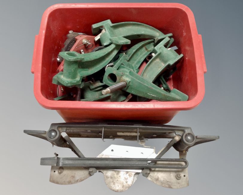 A box containing industrial metal cleats together with metal cutter