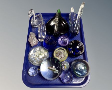 A tray of assorted paperweights, crystal paperweights, bird dishes